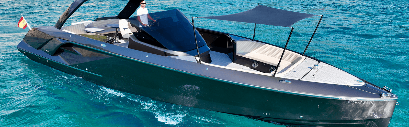 Frauschers new model 1441 - Hayley Su offers the perfect experience for cruising around Ibiza and Formentera , she has a large bathing platform and a comfortable seating area in her front and rear deck. You can connect your tunes via the bluetooth system, sit back relax and enjoy your day ! The silhouette of the Frauscher 1414 extends the typical design cues of the Frauscher boatyard - in particular the flat bow with vertical stem, the Z-shaped side line and the frameless windscreen - and offers more space and comfort than any other Frauscher with its free-standing helm.