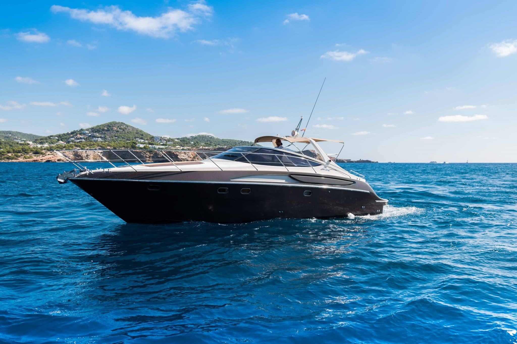 CHIC & SLEEK This nifty little number is perfect for enjoying a day of flying across the azure Balearic waters with yourfriends, comfortably fitting up to 10 passengers. Soak up the rays on the big padded sunbed area at the front or relax on the leather lounging area in the back as the boat nimbly navigates the waves.